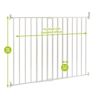 Der Aufbau des Schutzgitters ist einfach und dauert nur wenige Minuten. Das Gitter muss beidseitig verbohrt werden, um eine sichere Befestigung zu gewährleisten. Sie können die Verriegelung der Tür nach Ihren Wünschen auf der linken oder rechten Seite platzieren, und die Tür kann in alle Richtungen geöffnet werden. Diese Flexibilität ermöglicht es Ihnen, das Gitter an verschiedenen Stellen zu montieren, sei es in oder vor der Türöffnung oder am Anfang oder Ende der Treppe.