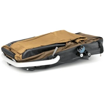 Dank Druckknopf kannst Du Deinen Hundeanhänger jetzt noch schneller und einfacher zusammenfalten – auf ein kompaktes Maß von 110 × 86 × 26 cm.