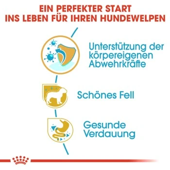 Aufgrund ihres angepassten Kalzium- und Phosphorgehalts trägt die Welpennahrung dazu bei, die Knochen und Gelenke Ihres Welpen während des Wachstums zu unterstützen. Zusätzlich helfen die ausgewählten Nährstoffe dabei, das ideale Körpergewicht Ihres Welpen zu fördern und zu erhalten.