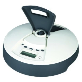 Der robuste und standfeste Futterautomat aus Kunststoff mit Gummifüßen ist batteriebetrieben und leicht zu reinigen (Batterien sind nicht im Lieferumfang enthalten).